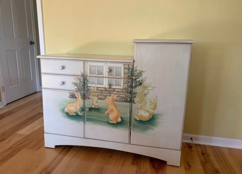 I cleaned out the closet and found this sweet dresser / changing table on the facebook marketplace. I’ve been using the marketplace quite a bit lately both for offloading stuff from our house and to find things for Goldie, like a practically-new Halo Bassinet. This dresser was marked down from $150 to $85, and it’s perfect for the space we have. It’ll last her for a long time – it’s solid wood and has such a sweet little painting on the front. I love it!