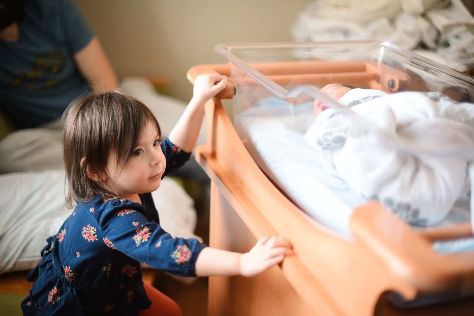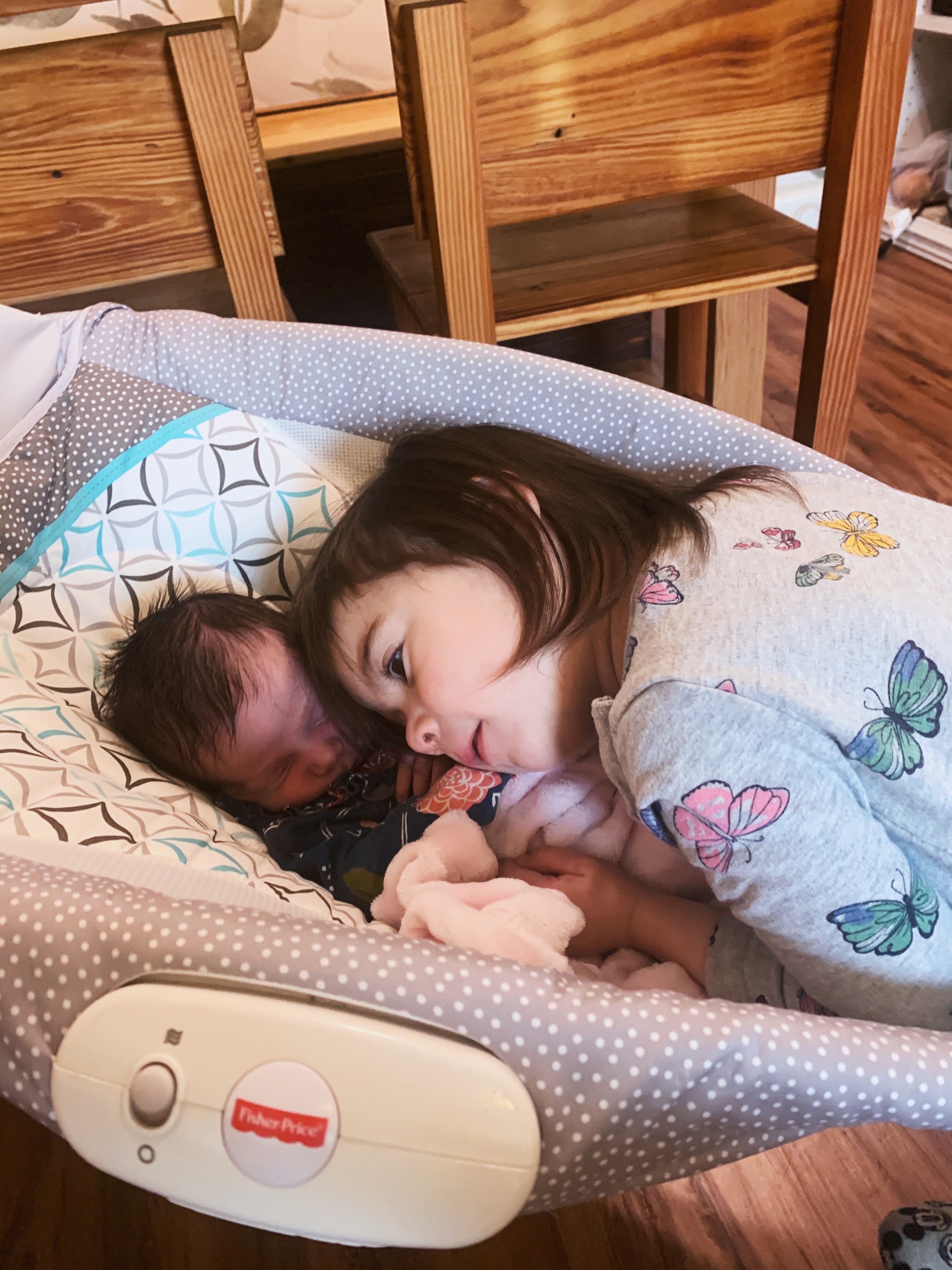 So this time around, all three of my major hopes came true. We checked out together, came home together, got to start newborn life at home together. And how is Penny taking all of this? Well, when she came to visit in the hospital she was supremely uninterested in Goldie. She gave her one look, declared she was, in fact, “baby sister,” and then pretty much hid from her the rest of the time. Not exactly the picture perfect moment I had in mind! But since we got home she has slowly but surely warmed up to the idea of this new creature, and I know soon she won’t remember life before Goldie. She started asking for “baby sister hugs,” and she gets pretty distressed on Goldie’s behalf when Goldie is crying. She mostly refers to her as “baby sister,” and although we’ve had more meltdowns than usual, I’m pretty sure she’s working through her emotions and she’ll stabilize soon enough.