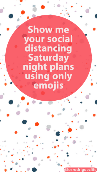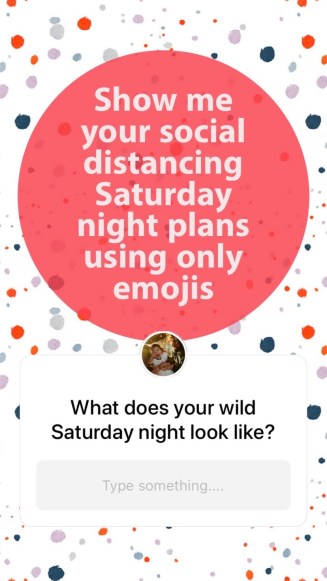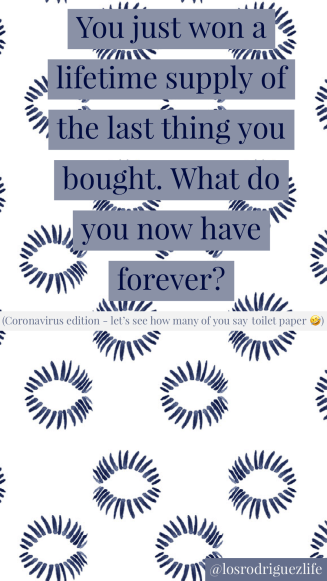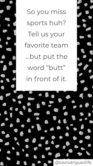 In an effort to encourage some social interaction in this time of social distancing, we created ten prompts you can put on facebook, instagram, or in your instagram stories to get your friends and family interacting and hopefully laughing! Pretty much every comment to these puts a smile on my face, and that’s pretty valuable during a time when we could all use some more smiles! I left a space in the stories prompts where you can put a “question” prompt – see the example below.