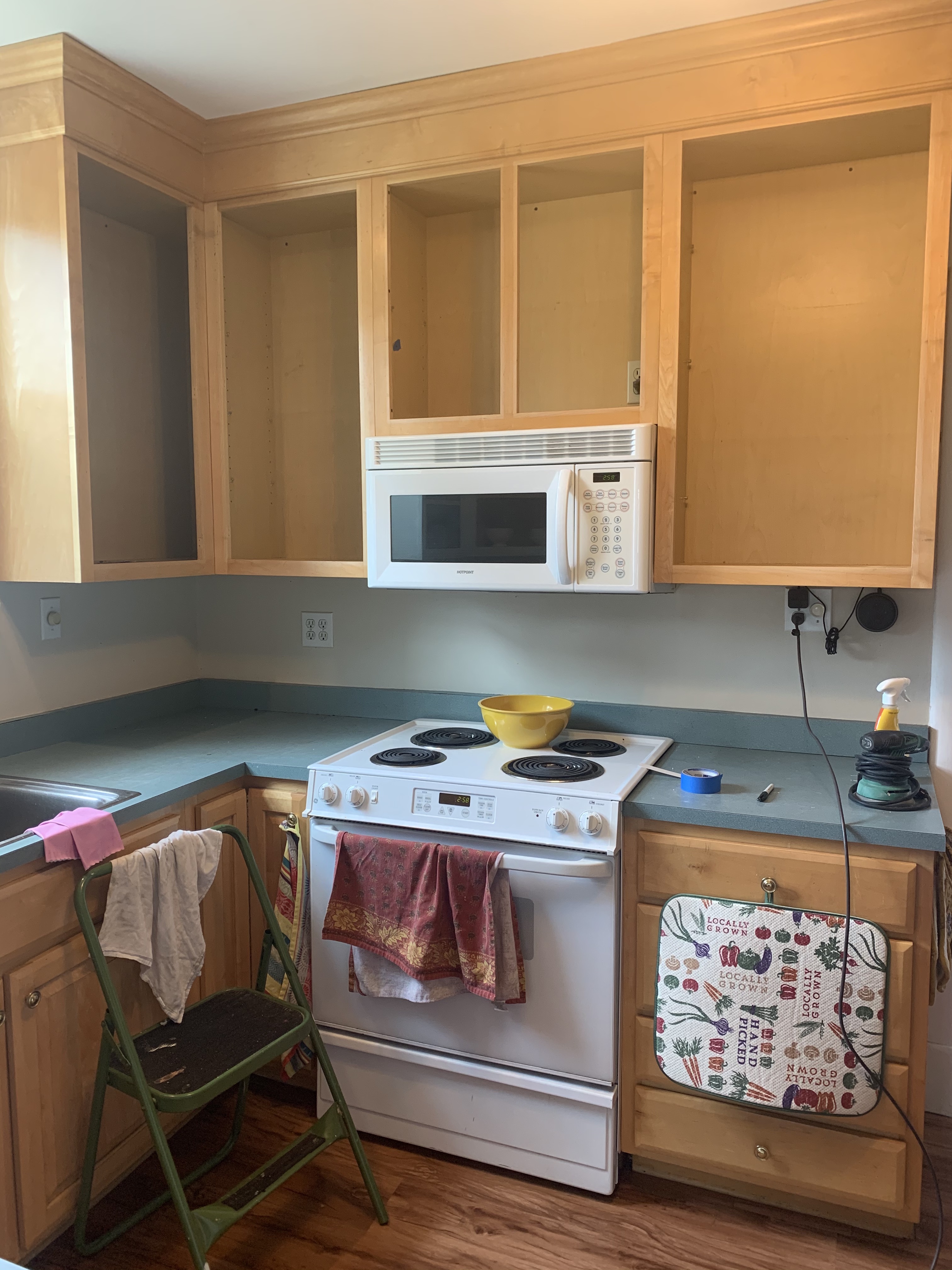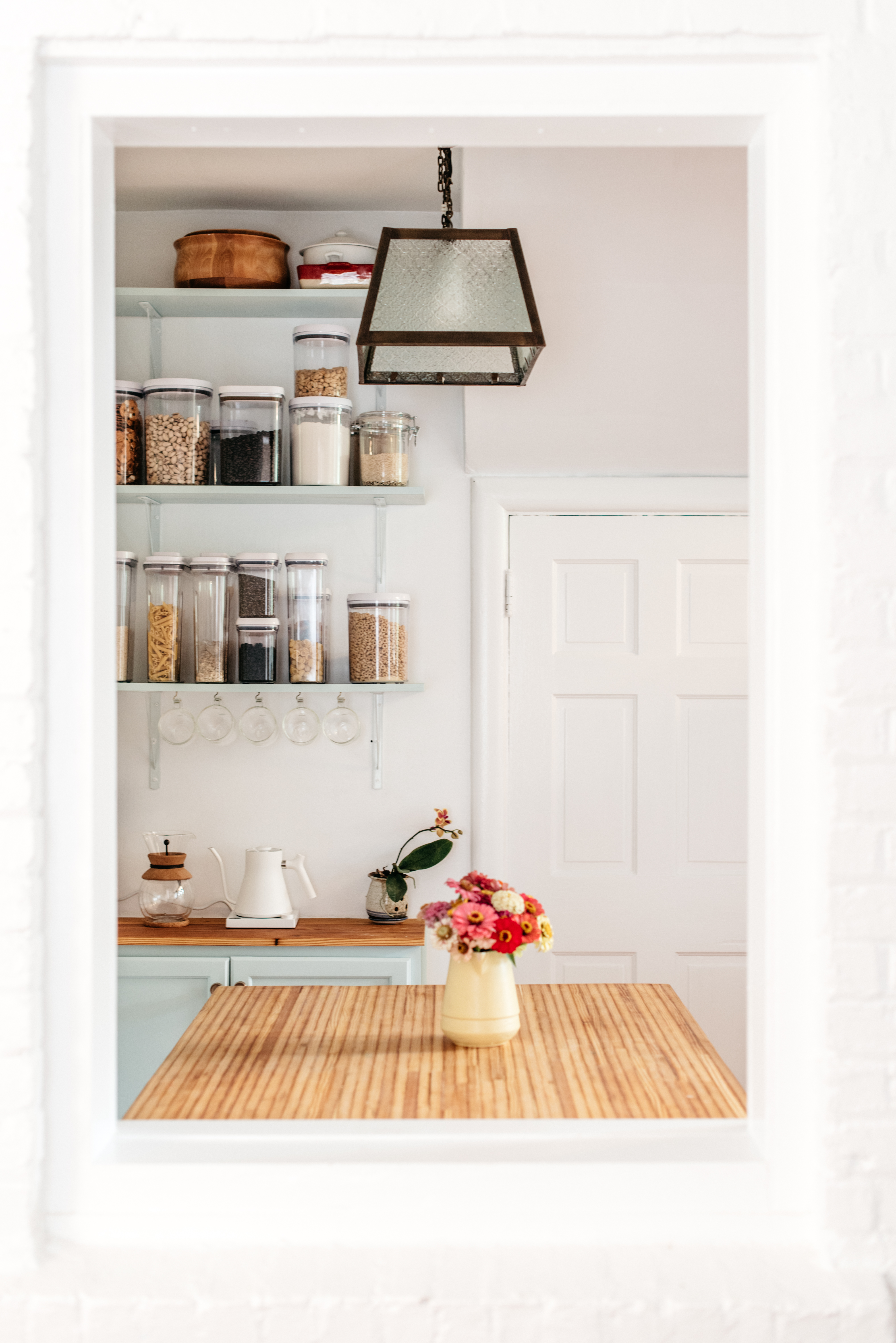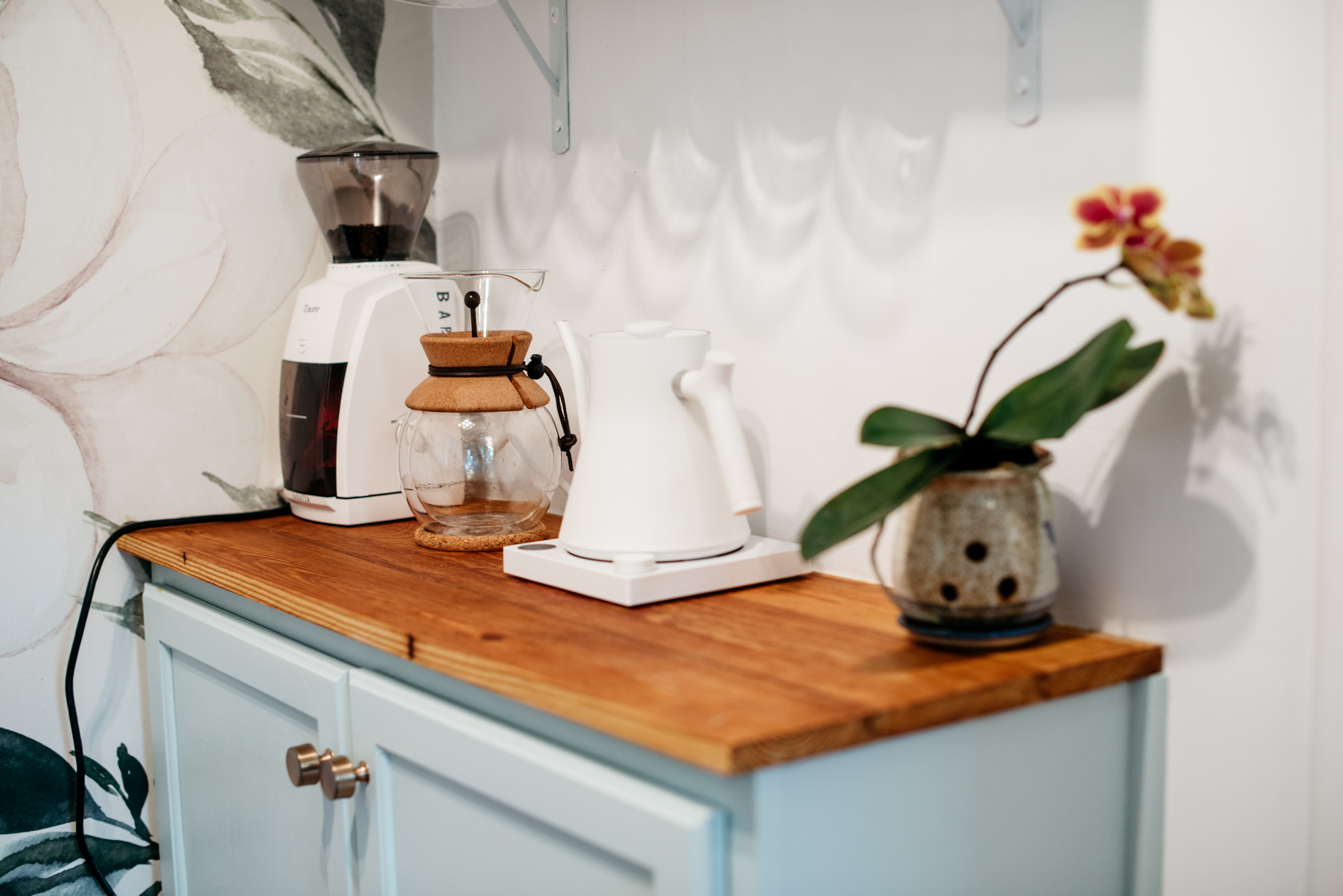 The last big project Javier completed was a coffee bar in the back corner of the kitchen. We’ve been working on this little nook for a very long time, and the bookshelf was a cluttered, clunky mess in an otherwise-beautiful space. We decided it would be a good place to store dried goods in open shelving and to keep my coffee gadgets. Javi removed the shelves from the bookshelf and painted them the same color as the cabinets. He installed them in the wall using white brackets to blend with the wall. He ordered and installed a wall cabinet beneath the shelves – a base cabinet was too deep and didn’t allow for enough space between the bench and the cabinet. The wall cabinet was the perfect depth. We keep Penny’s art supplies in the cabinet for now.