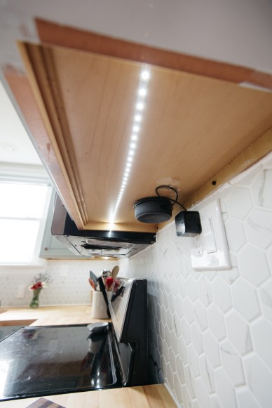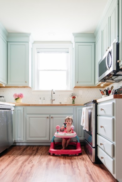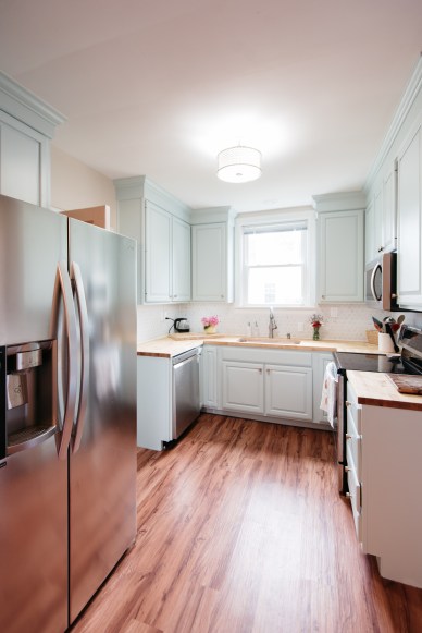 There are a few other major changes that we made to the kitchen to tie it all together: new appliances, new lighting, a backsplash, and a coffee bar. We chose stainless steel appliances and we’re THRILLED to finally have a dishwasher that doesn’t sound like a motorcycle gang is idling in our kitchen. We picked out our light fixture from Wayfair – it was on clearance and it makes a huge difference in the room. Javi also added under-cabinet LED lighting. He used peel-and-stick LED strips that plug into the wall – they are super easy to install and add a ton of light to a kitchen with only one window (limited natural light).