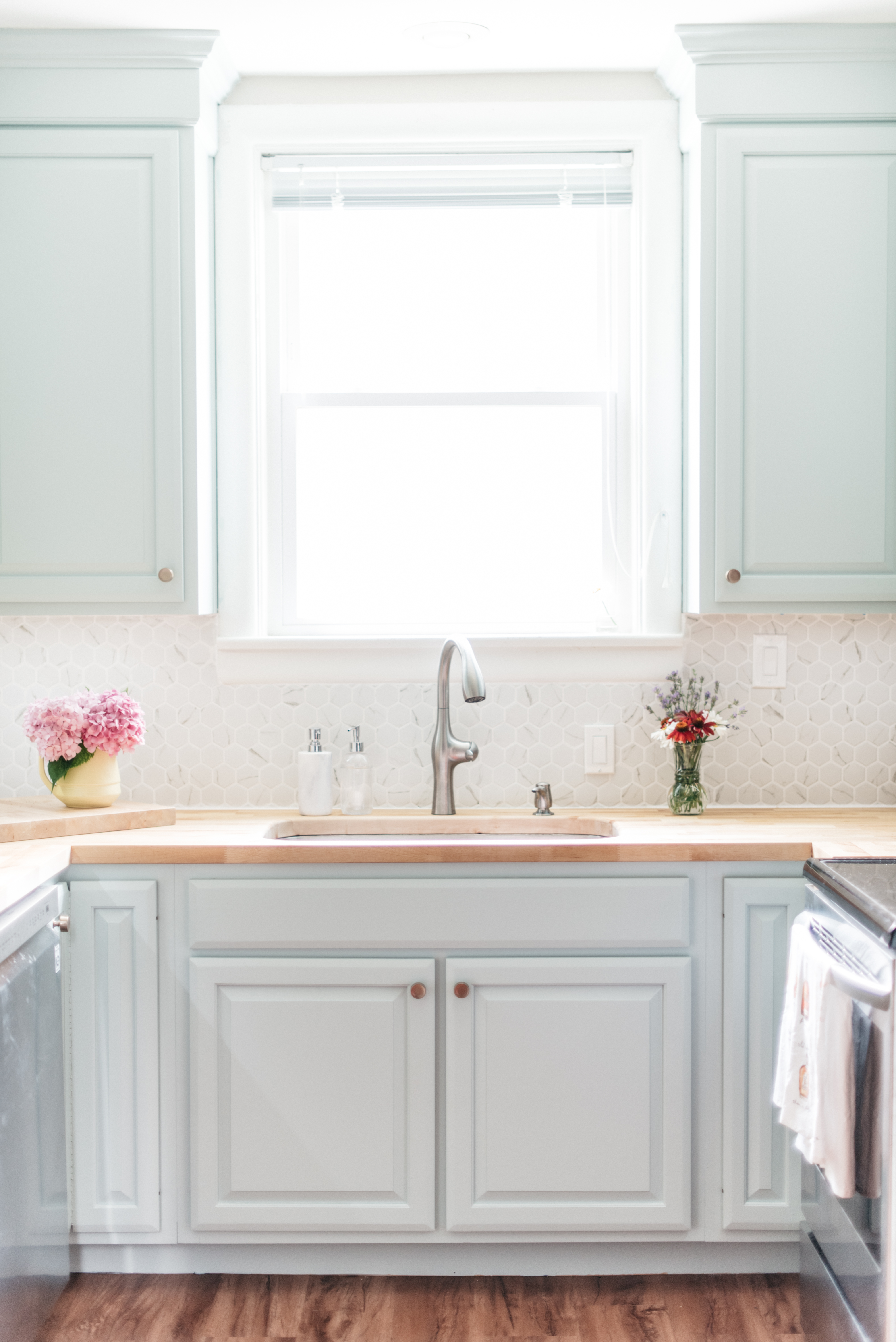 The absence of a backsplash has been a thorn in my side since we moved in. I don’t know why it bothered me so much that we didn’t have one – I just think it ties a kitchen together so nicely, and it’s easier to clean food splatter off of tile than a painted wall. We originally thought we’d get classic Subway tile, but we ultimately landed on sheets of small hexagonal tiles. The sheets were fairly easy for Javi to install – the only major pain was cutting hundreds of tiny triangles to fill in the gaps at the top and bottom. He was a tile cutting grout master by the end of the project. I LOVE the hexagons and the final look is so clean and beautiful!